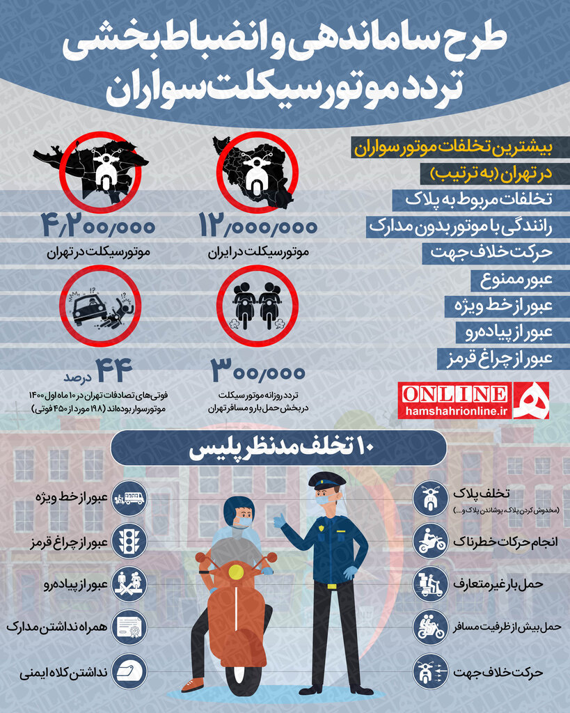 پرتکرارترین تخلفات موتورسیکلتسواران تهران را که در بررسی اجرای طرح ساماندهی و انضباطبخشی موتورسواران در این کلانشهر به دست آمده است، در اینفوگرافیک ببینید.